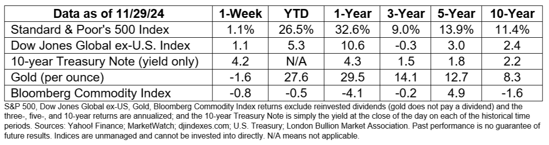 Last week, stocks jolted up and down as investors responded to data about political appointments, tariffs, and inflation data. By the end of the week, major U.S. indices were higher. Treasury bonds gained, too, as yields moved lower after president-elect Donald Trump nominated hedge-fund billionaire Scott Bessent to be U.S. Treasury Secretary. Many believe Bessent could be a moderating influence when it comes to taxes, tariffs, and the deficit, reported Mitchell Hartman of Marketplace.