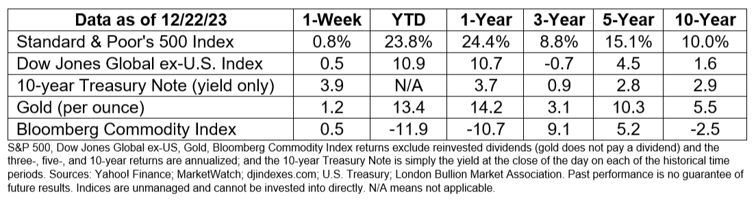 https://www.bloomberg.com/news/articles/2023-12-21/stock-market-today-dow-s-p-live-updates?srnd=markets-vp (or go to https://resources.carsongroup.com/hubfs/WMC-Source/2023/12-26-23_Bloomberg_US%20Stock%20Gauges%20Log%20Longest%20Weekly%20Run%20in%20Years_9.pdf)