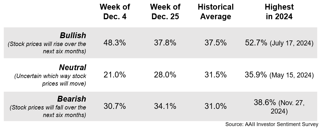 Individual investors, on the other hand, were feeling less bullish than they did earlier in the month. The AAII Investor Sentiment Survey found that investors’ outlook shifted in December. Investors became more uncertain, and a higher percentage reported feeling bearish.