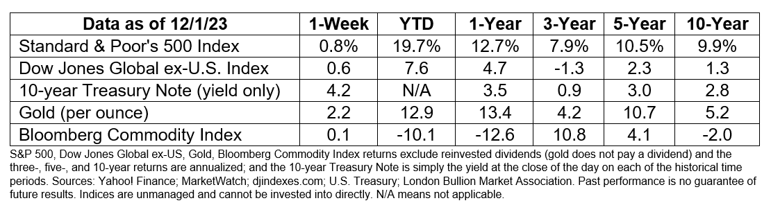 Major U.S. stock indices finished last week higher, reported Barron’s, and U.S. Treasury yields moved lower as investors embraced the idea that rate cuts may be ahead in 2024.