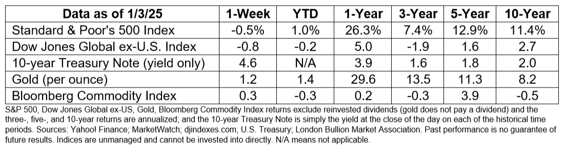 Last week, which was shorter than usual due to the New Year’s holiday, major U.S. stock indices finished lower. The yield curve continued to steepen as yields on shorter maturities of U.S. Treasuries fell, while yields on longer maturities rose.