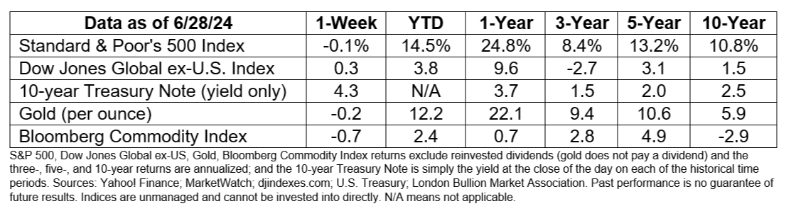 Last week, major stock market indices delivered a mixed performance. Connor Smith of Barron’s reported, “The Dow rose 3.8% in the first half of the year. The S&P 500 rose 14.5%. The Nasdaq Composite rose 18%.” Yields on longer maturities of U.S. Treasury bonds moved higher over the week.