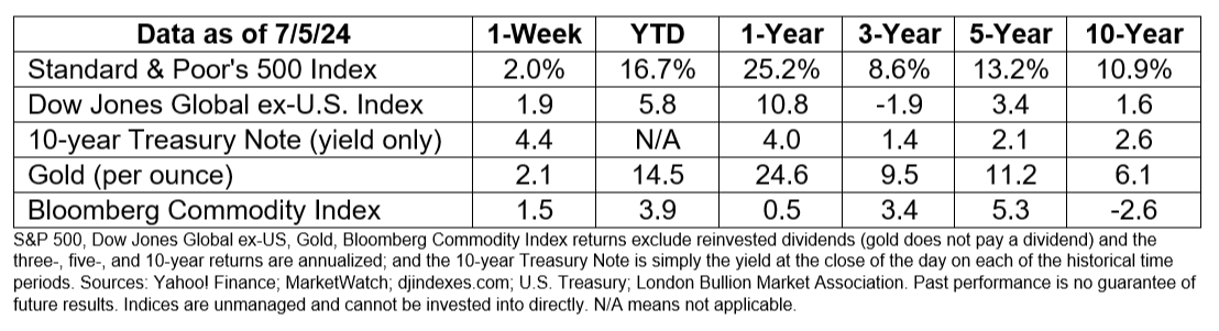 - Bounding ahead. U.S. stocks rallied in May and June as companies in the Standard & Poor’s (S&P) 500 Index reported strong earnings growth for the first quarter of 2024. Overall, earnings, which represent companies’ net profits, grew 6 percent, and 78 percent of S&P 500 companies were more profitable than analysts had expected, according to John Butters of FactSet.
