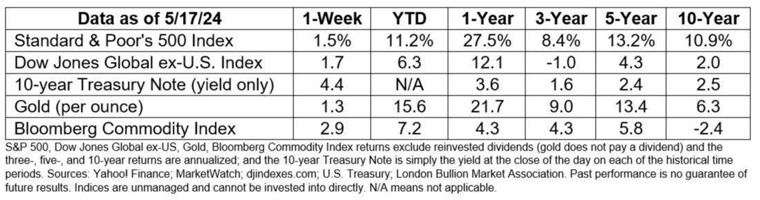Investors found a lot to like in the inflation data. U.S. stocks finished the week higher with the Dow Jones Industrial Average closing above 40,000. Yields on most maturities of U.S. Treasuries moved lower over the week, lifting bond prices.
