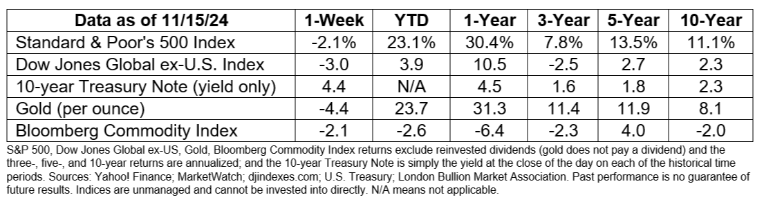 The likelihood that the Fed may lower rates more slowly than expected roiled markets. Lu Wang, Isabelle Lee, and Emily Graffeo of Bloomberg reported, “With the world’s most important central banker in no hurry to ease monetary policy thanks to a still-robust labor market and strong economic data, bond yields once again rose and dragged stocks lower in their wake. Down 2 [percent] over five sessions, the S&P 500 erased half of its trough-to-peak gains since the election. Combined with losses in corporate credit and commodities, the week rounded out a pan-asset retreat that by one measure was the worst in 13 months.”