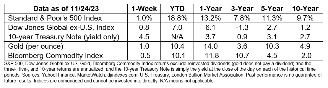 Stocks moved higher last week as many investors remained confident the Federal Reserve was done raising rates. Some anticipate rate cuts early next year, reported Barron’s. Bond markets weren’t so sure, though, and U.S. Treasury yields moved broadly higher during the week.