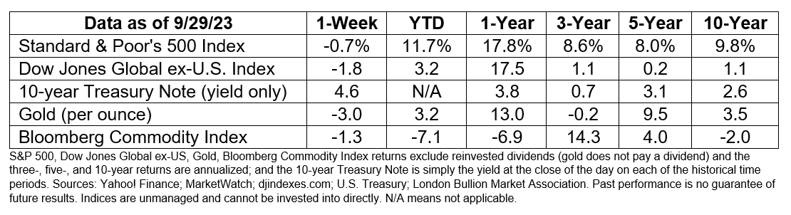 Regardless of oil prices, investors were hopeful last week that the Fed might not raise rates again in 2023. Revised economic data from the Bureau of Economic Analysis showed the economy grew at a slightly slower pace in the second quarter of 2023 than it did in the first quarter. In addition, consumer spending, which is the primary driver behind economic growth in the United States, cooled. The data suggest the Fed is making progress – reducing price pressures by slowing economic growth and lowering demand for goods.