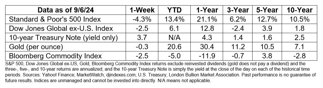 One reason for the sharp stock market decline last week appeared to be concerns that the Federal Reserve may have waited too long to lower rates. During the week, economic data continued to present a mixed picture of the U.S. economy. The employment report released on Friday showed the United States added about 142,000 jobs in August—a significant increase from July—and that average hourly earnings were up 3.8 percent year over year. In addition, the unemployment rate ticked lower to 4.2 percent.